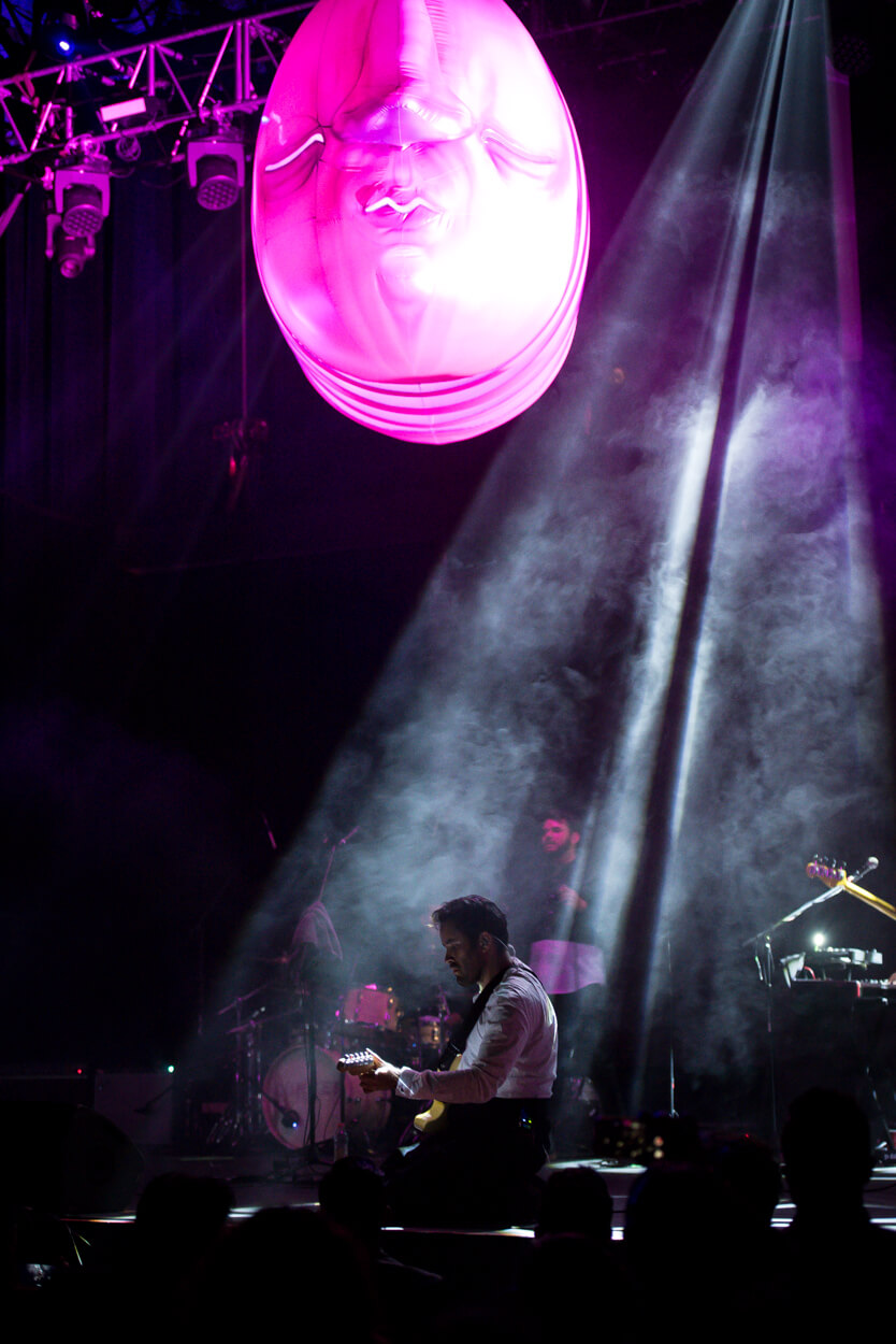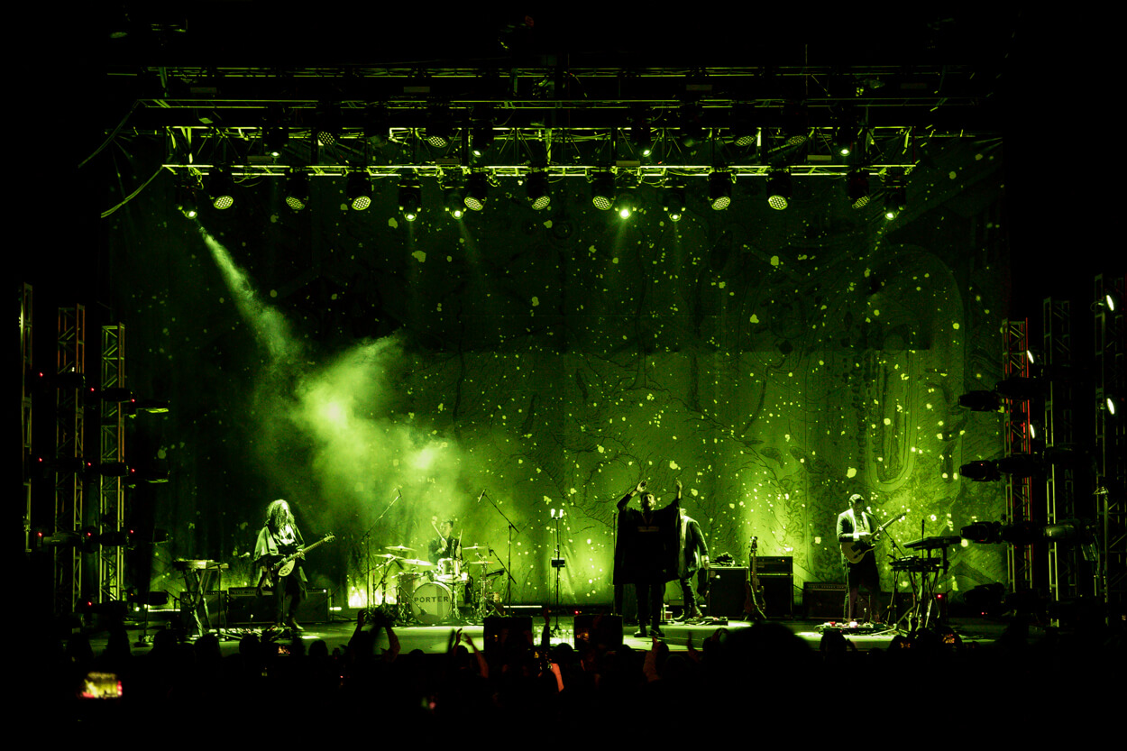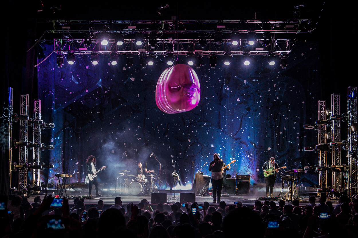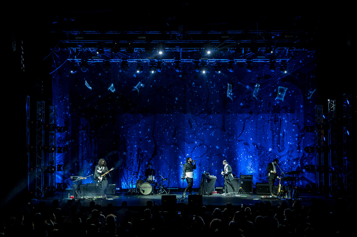We designed a new concept for Porter to use in their concerts. A giant prop in shape of an abstract head that lights up in different colors as it hangs on top of the band. A backdrop stage & a big abstract illustration that projects light through perforations; all active with a synchronized light show that develops throughout the concert in different ways.